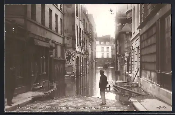 AK Paris, Crue de la Seine, Rue de la Bucherie inondée avec un homme observant l`eau