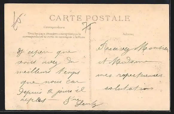 Personenbezogene Daten auf der Rückseite der Karte wurden durch blauen Textmarker unkenntlich gemacht. Die blauen Stellen sind auf die Vorderseite durchgeweicht und wirken sich negativ auf das Postkartenfoto aus