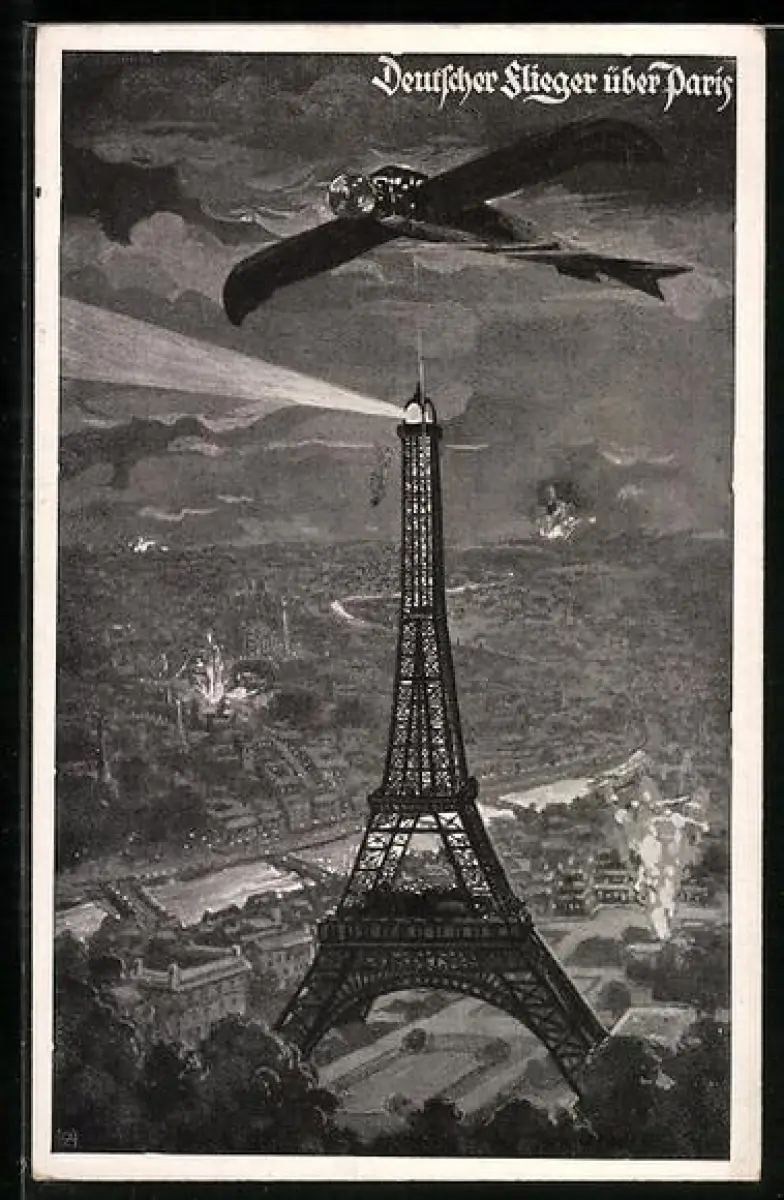 AK Paris, Flugzeug, Deutscher Flieger bei einem Bombenangriff über dem Eiffelturm
