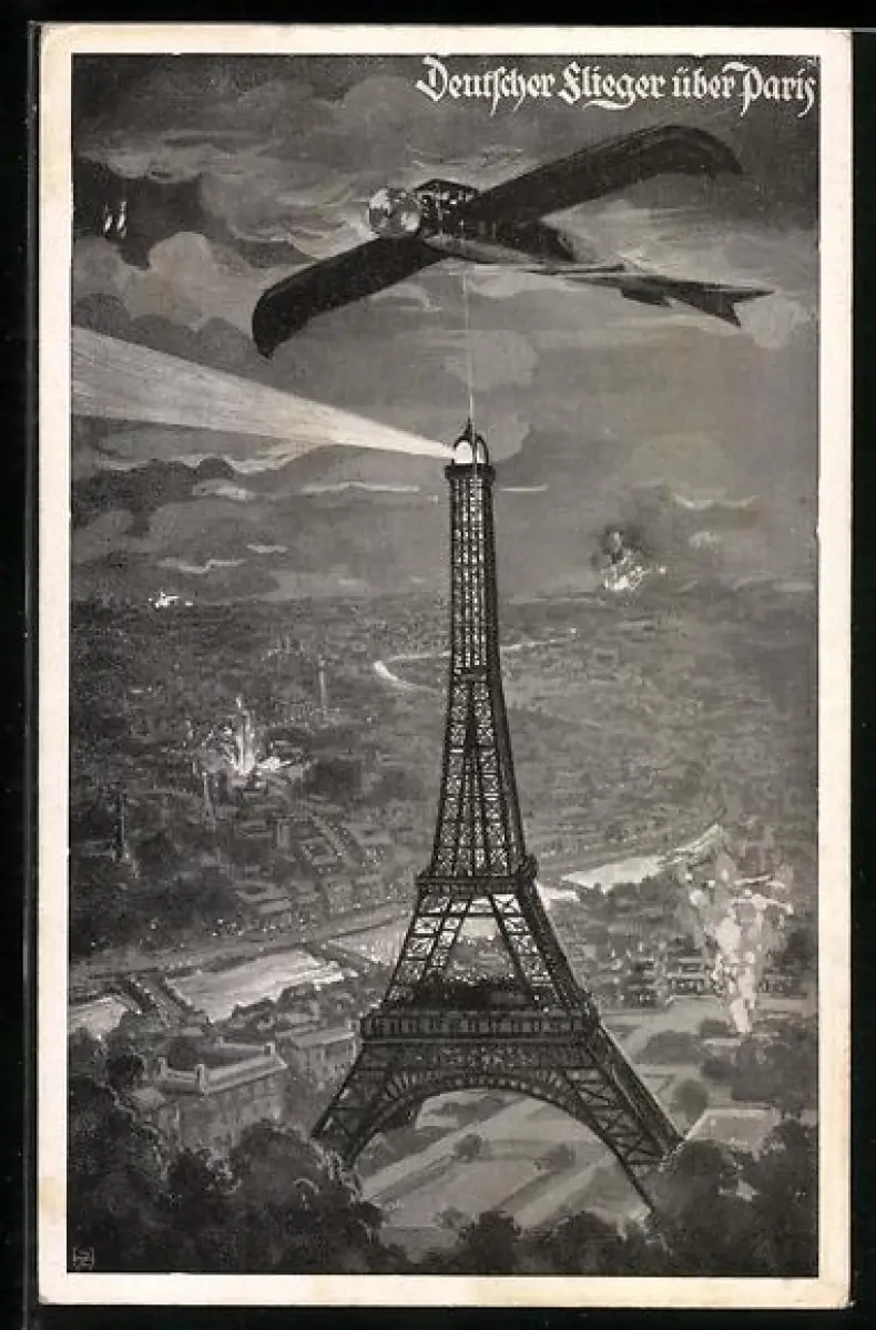 AK Paris, Flugzeug, Deutscher Flieger bei einem Bombenangriff über dem Eiffelturm