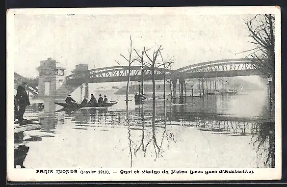 AK Paris, Inondation 1910, Quai et viaduc du métro prés gare d`Austerlitz, Ruderboot