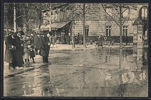 AK Paris, Inondation à la Place de l`Alma 1910, passants face aux eaux