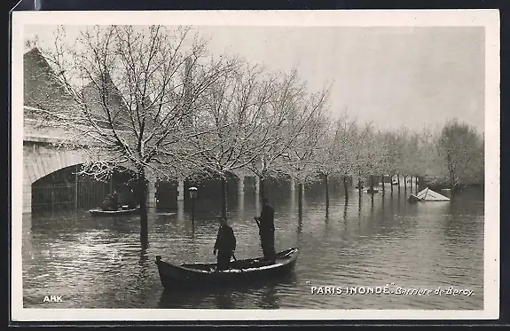 AK Paris, Inondation, barque sous le pont et arbres inondés