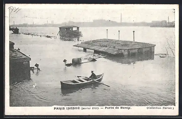 AK Paris, Inondation de 1910 à la Porte de Bercy avec barque et bâtiments submergés