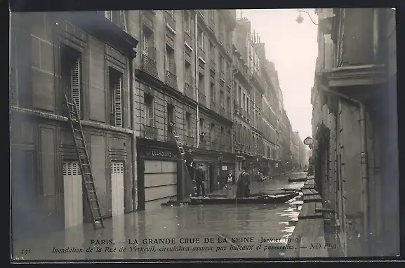 AK Paris, Inondation de la Rue de Verneuil 1910, circulation assurée par bateaux et passerelles