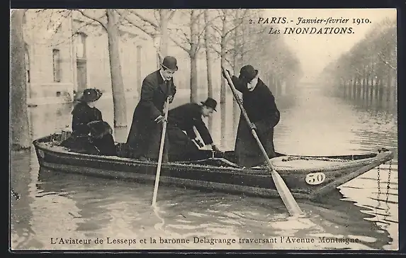 AK Paris, Inondations Janvier-février 1910, L`Aviateur de Lesseps et la barone Delagrange traversant l`Avenue Montaigne