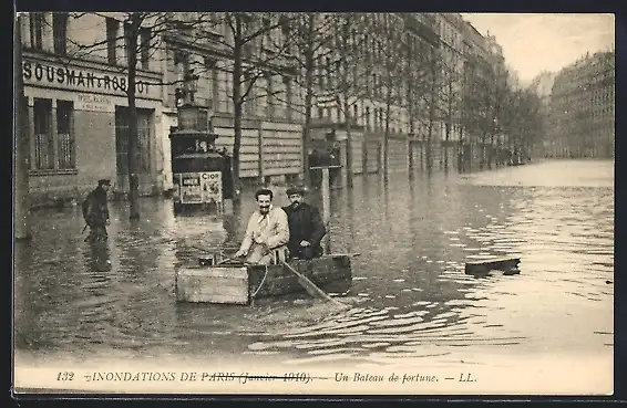 AK Paris, Inondations de 1910, Un bateau de fortune naviguant dans les rues inondées