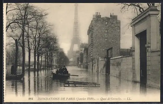 AK Paris, Inondations de janvier 1910, Quai de Grenelle et vue sur la Tour Eiffel