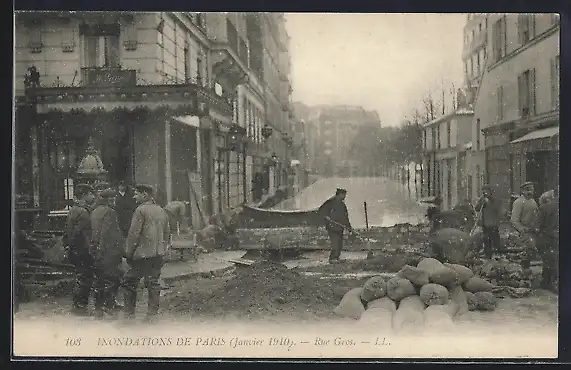 AK Paris, Inondations de janvier 1910, Rue Gros avec sacs de sable et ouvriers