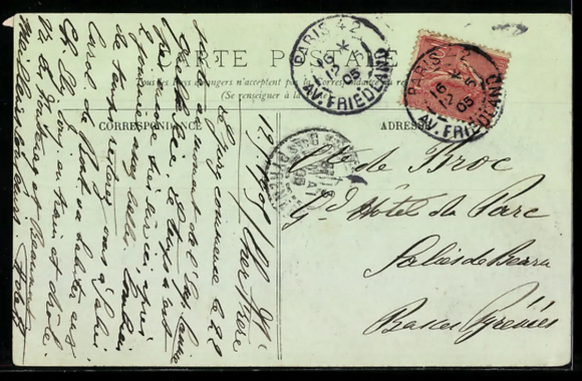 gelaufen 1905, Eckknicke unten u. re., Eckschaden unten li., Abriebspur oben re., Stempelspur, guter Zustand