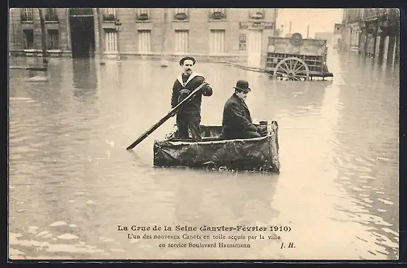 AK Paris, La Crue de la Seine 1910, L`un des nouveaux Canots en toile acquis par la ville, Blv. Haussmann