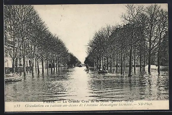 AK Paris, La Grande Crue de la Seine, Janvier 1910, Circulation en bateau au-desus de l`Avenue Montaigne inondée