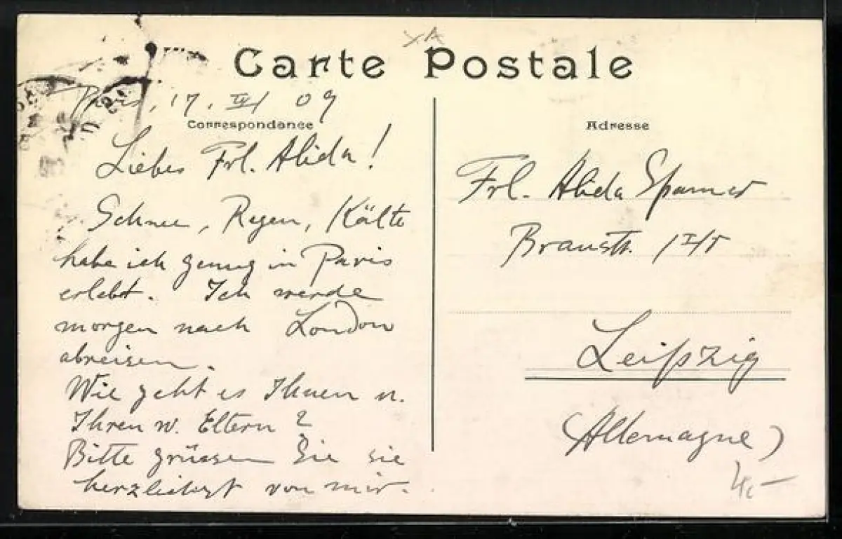 Personenbezogene Daten auf der Rückseite der Karte wurden durch blauen Textmarker unkenntlich gemacht. Die blauen Stellen sind auf die Vorderseite durchgeweicht und wirken sich negativ auf das Postkartenfoto aus