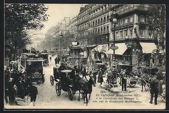 AK Paris, Le Carrefour Montmartre dit le Carrefour des Ecrasés, vue sur le Boulevard Montmartre