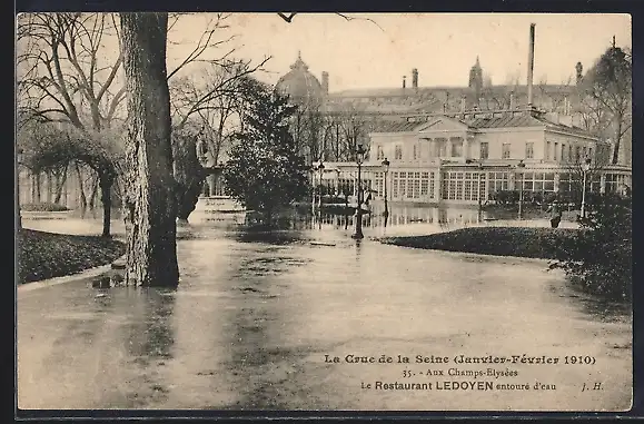 AK Paris, Le Restaurant Ledoyen entouré d`eau durant la crue de la Seine (Janvier-Février 1910)