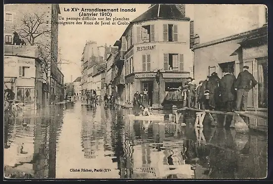 AK Paris, Le XV. Arrondissement inondé, un passage difficile sur les planches, 1910