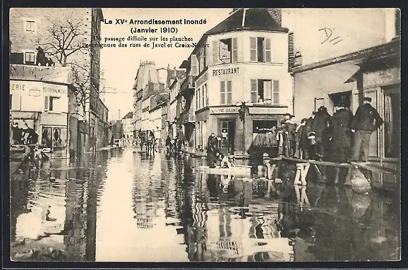 AK Paris, Le XVe Arrondissement inondé, passage difficile sur les planches (Janvier 1910)