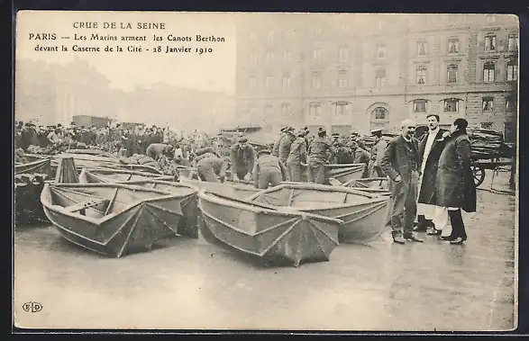AK Paris, Les Marins arment les Canots Berthon devant la Caserne de la Cité, 28 Janvier 1910