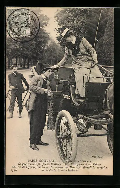 AK Paris, Nouveau, Frau sitzt auf einem Automobil, Ein Radfahrer dahinter, Emanzipation