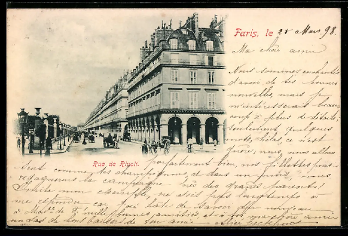 AK Paris, Rue de Rivoli avec passants et calèches