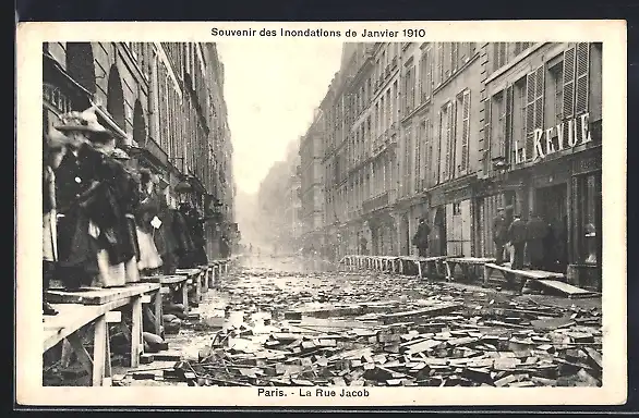 AK Paris, Souvenir des Inondations de Janvier 1910, Rue Jacob inondée et piétons sur passerelles