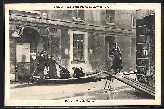 AK Paris, Souvenir des Inondations de Janvier 1910, Rue de Seine avec barque et passants