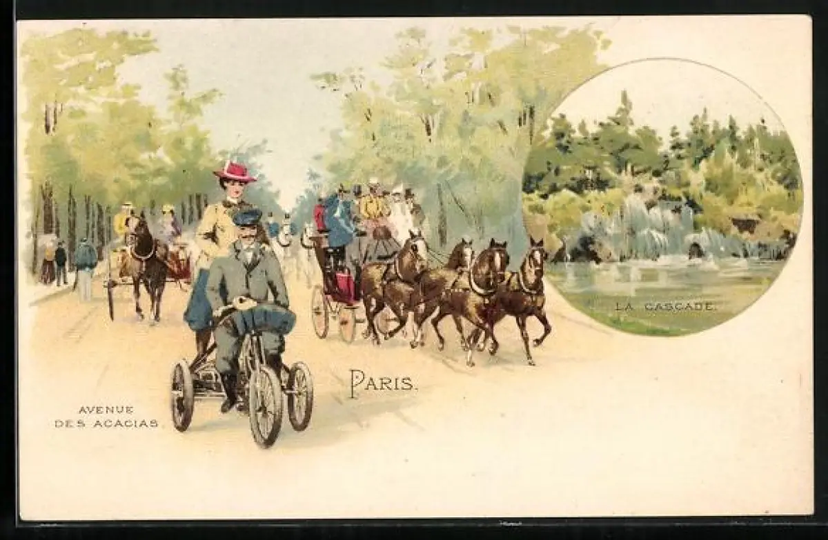AK Paris XVII, Fahrradfahrer und Kutschen in der Avenue des Acacias