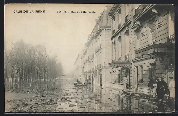 AK Paris, inondations de janvier 1910, la rue de l`Université, des gens et des passerelles