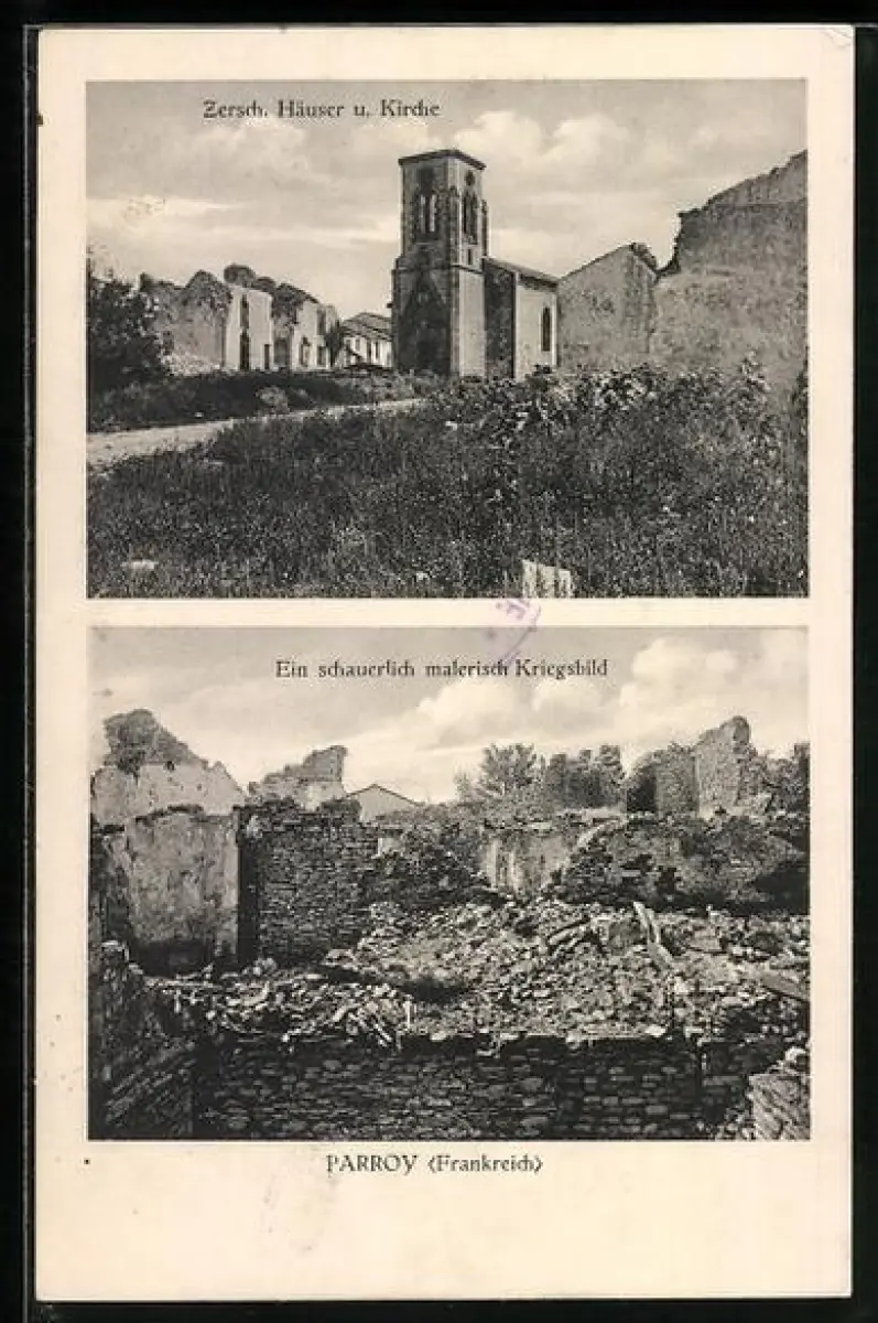 AK Parroy, Maisons et église détruites, image de guerre pittoresque et effrayante