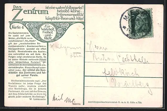 Personenbezogene Daten auf der Rückseite der Karte wurden durch blauen Textmarker unkenntlich gemacht. Die blauen Stellen sind auf die Vorderseite durchgeweicht und wirken sich negativ auf das Postkartenfoto aus