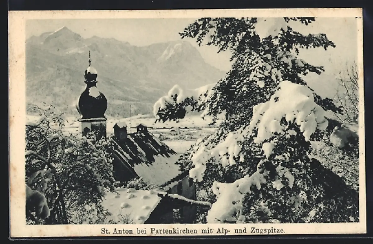 AK Partenkirchen, Kirche mit Alp- u. Zugspitze im Winter