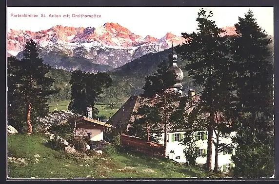 AK Partenkirchen, Ortsansicht mit Dreithornspitze