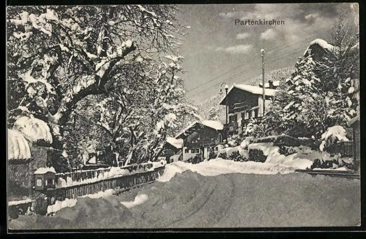 AK Partenkirchen, Winterliche Ortspartie mit verschneiten Häusern und Bäumen