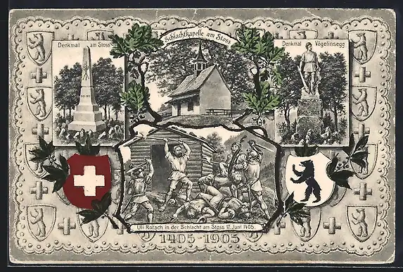 AK Pass Stoss, Schlachtkapelle am Stoss, Denkmal am Stoss, Denkmal Vögelinsegg, Uli Rotach in der Schlacht 1405