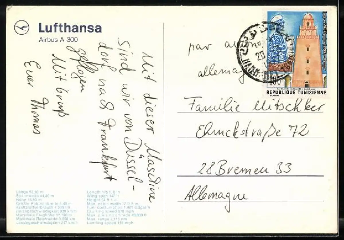 AK Passagierjet Airbus A 300 über den Wolken, Lufthansa, Tech. Daten, Flugzeug