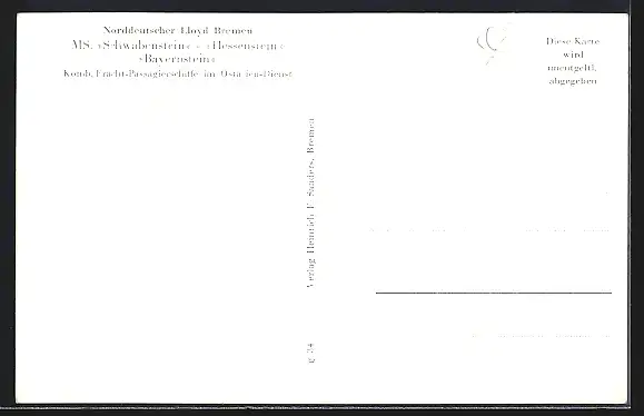 AK Passagierschiff MS Schwabenstein des Norddeutschen Lloyd auf offenem Meer