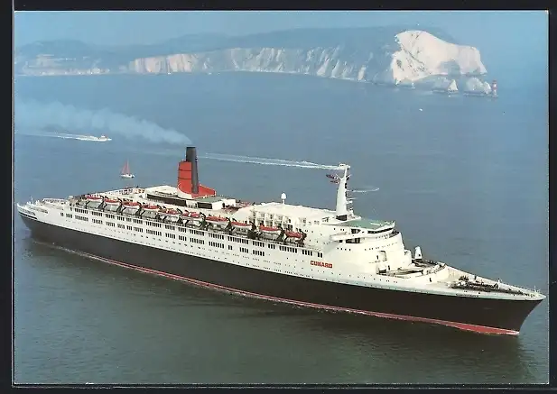 AK Passagierschiff Queen Elizabeth 2 der Cunard Line vor einer Insel