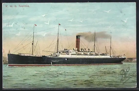 AK Passagierschiff RMS Ivernia vor der Küste vor Anker liegend