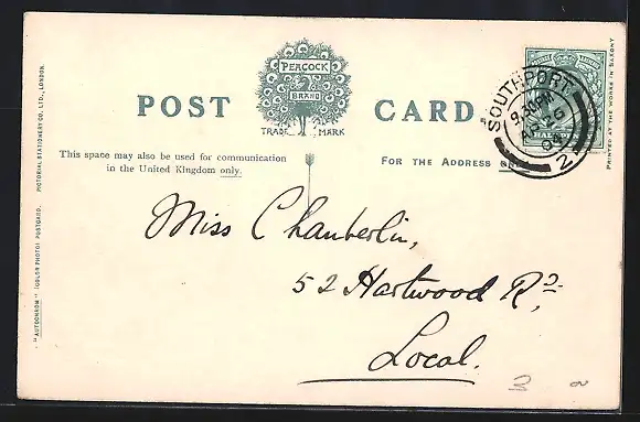 Personenbezogene Daten auf der Rückseite der Karte wurden durch blauen Textmarker unkenntlich gemacht. Die blauen Stellen sind auf die Vorderseite durchgeweicht und wirken sich negativ auf das Postkartenfoto aus