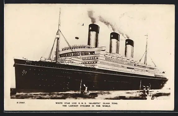 AK Passagierschiff R.M.S. Majestic unter Dampf mit Schleppern, White Star Line