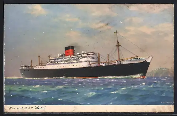 AK Passagierschiff R.M.S. Media vor einer Insel, Cunard Liner