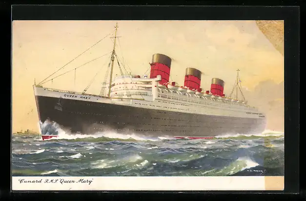 AK Passagierschiff R.M.S. Queen Mary in stürmischer See, Cunard Line