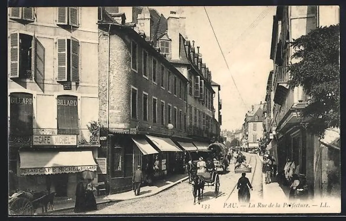 AK Pau, La Rue de la Préfecture animée avec passants et charrettes