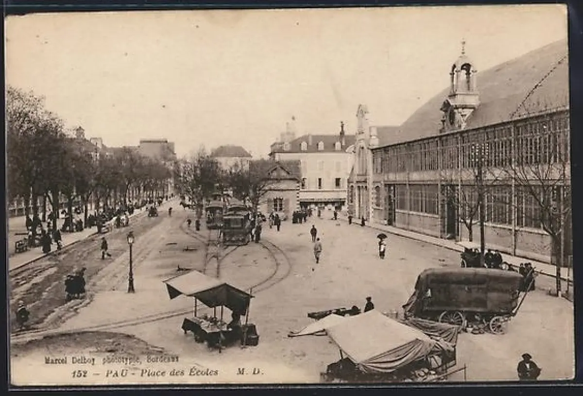 AK Pau, Place des Écoles avec tramway et marché animé