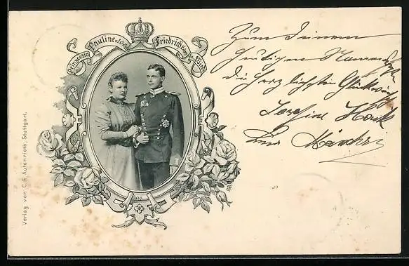 AK Pauline v. Württemberg und Erbprinz Friedrich, Portrait im Rahmen mit Krone u. Rosen