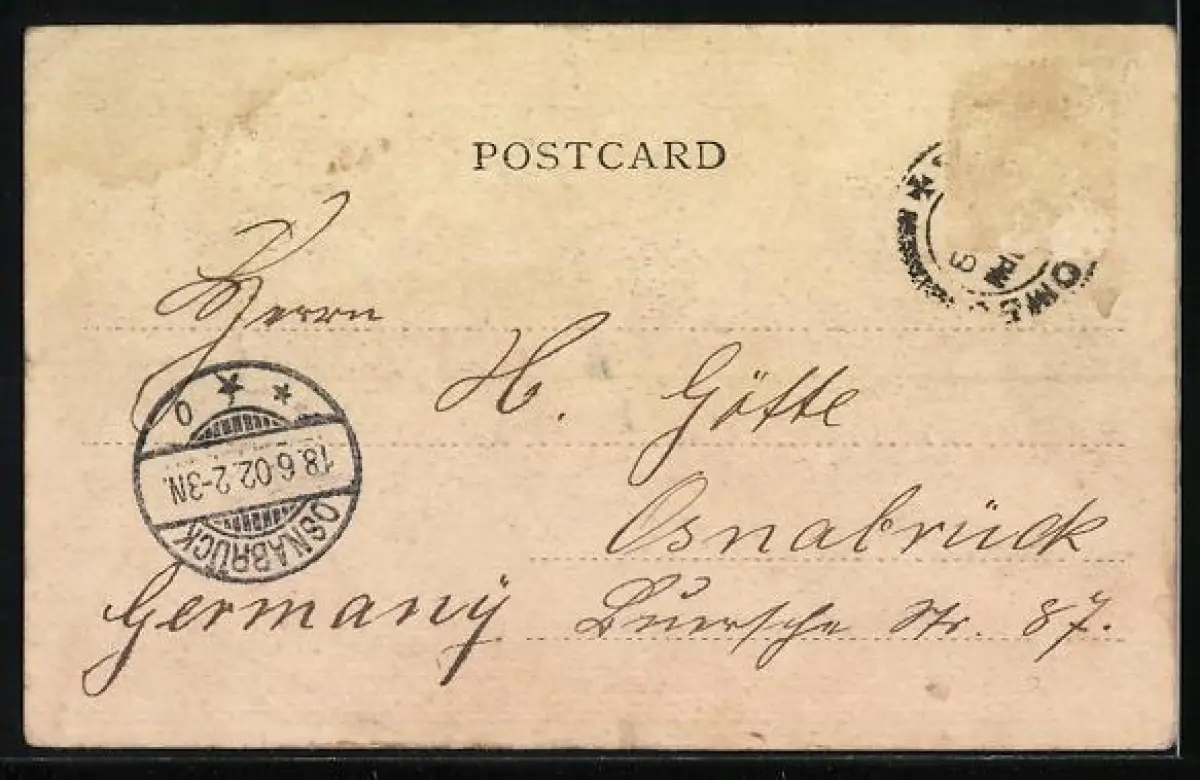 alte Ansichtskarte, gelaufen 1902, Briefmarke entfernt, rückseitig Oberflächenschaden, Eckknick re. oben, guter Zustand
