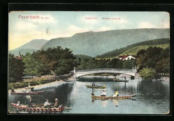 AK Payerbach, Ortsbrücke, Brücke mit Ruderbooten, Blick zur Raxalpe