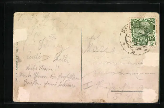 alte Ansichtskarte, gelaufen, Ecken bestoßen, rückseitig Oberflächenschaden, guter Zustand