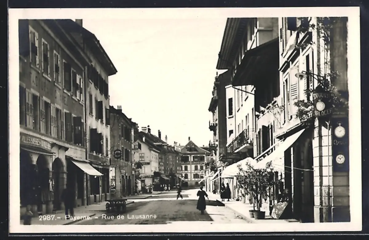AK Payerne, Rue de Lausanne mit Läden
