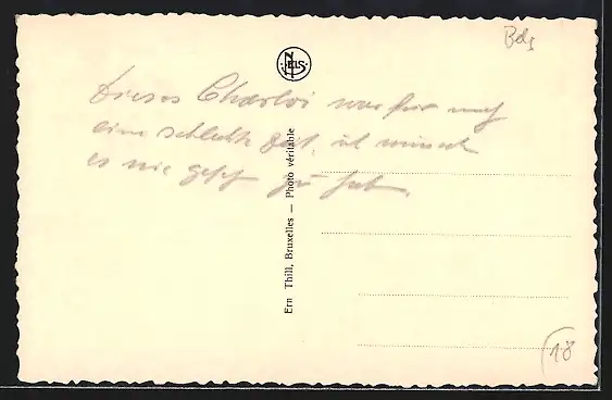 Personenbezogene Daten auf der Rückseite der Karte wurden durch blauen Textmarker unkenntlich gemacht. Die blauen Stellen sind auf die Vorderseite durchgeweicht und wirken sich negativ auf das Postkartenfoto aus